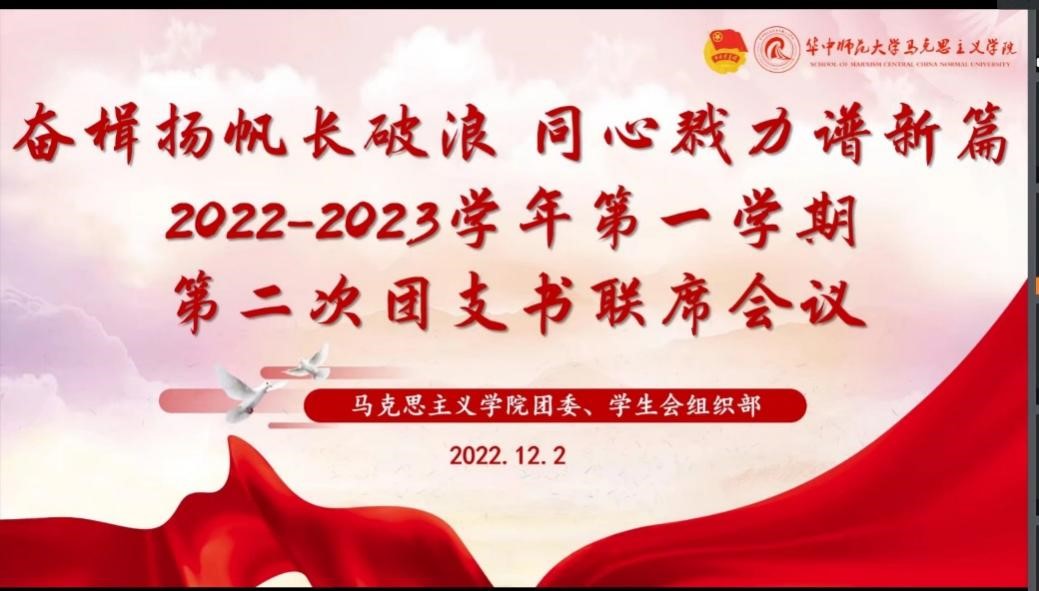 马克思主义学院讯(通讯员 邓潇潇;摄影 童静柔)12月2日中午,马克思主义学院2022-2023学年第一学期第二次团支书联席会议在线上举行。本次会议由马克思主义学院团委、学生会组织部举办,组织部全体成员和各团支部负责人参加本次会议,组织部成员雷舒涵担任主持人。