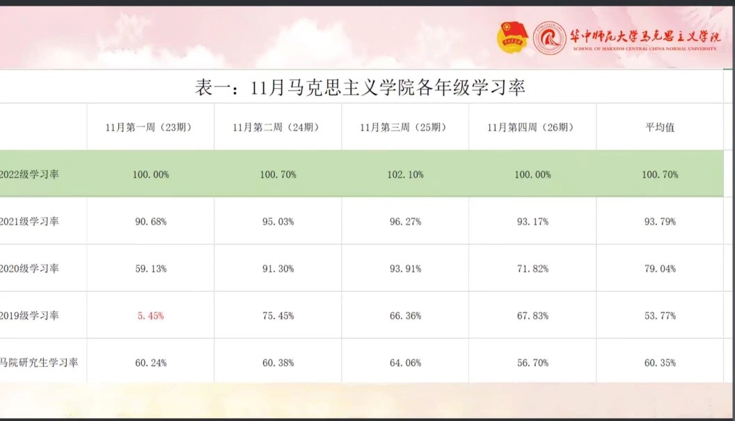 会议中,组织部负责人刘晋玮总结了青年大学习学习情况。他介绍了11月马院各年级的青年大学习学习情况,其中2022级的青年大学习完成率最高,希望其能够继续保持;2019级学习率较低,希望团支书能够加以督促。同时,他对10月、11月马院各年级青年大学习完成率进行对比,显示在各团支部干部的督促下各年级完成率都有所增长。最后,刘晋玮嘱托各团支书,在紧张的期末复习阶段之余督促同学们积极地完成青年大学习。