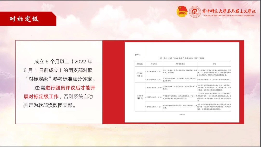随后,组织部负责人杨思琪讲解对标定级工作,深化各团支书对于工作方法的认识。她指出除2022级外,各团支书都必须进行团员评议后,对照“对标定级”参考标准对团支部进行赋分评定。同时,她对参考标准中的具体指标要求和注意事项进行详细说明,以方便各团支书的评定工作。在最后的答疑与交流环节,组织部负责人就提出的有关对标定级的分值分布、具体指标等问题做出解答。