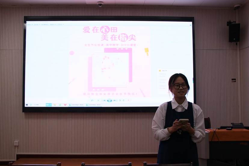 马克思主义学院讯(通讯员 李文奕;摄影 李文奕)3月7日,马克思主义学院“爱在心田,美在指尖”女生节主题活动在一号楼三楼学术报告厅举行。本次活动由我院文艺部组织举办,由文艺部成员邹涛主持。团委书记赵芸逸、本科生辅导员田聪娇及学院本、研女生参与此次活动。
