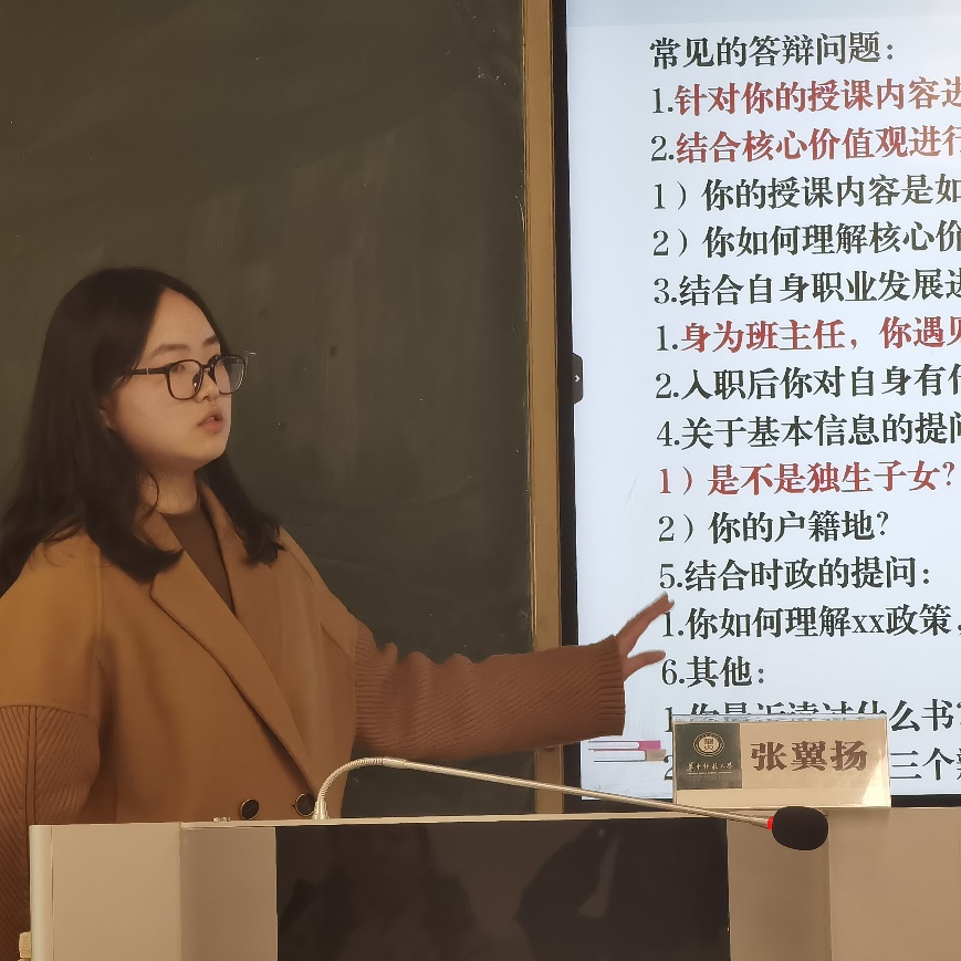 第二位分享者张翼扬从师范生的实习与就业两个部分展开了经验分享。在师范生实习方面,她对实习时间、实习地点选择、实习期间人际关系处理等方面的注意事项进行了详细介绍,同时鼓励大家充满信心,积极锻炼师范生技能,为后期做好充分准备。在师范生就业方面,张翼扬围绕就业信息获取渠道、简历制作设计、招聘考核环节等方面展开了介绍,并对笔试环节、面试环节、答辩环节和结构性面试环节的注意事项进行了详尽分享。