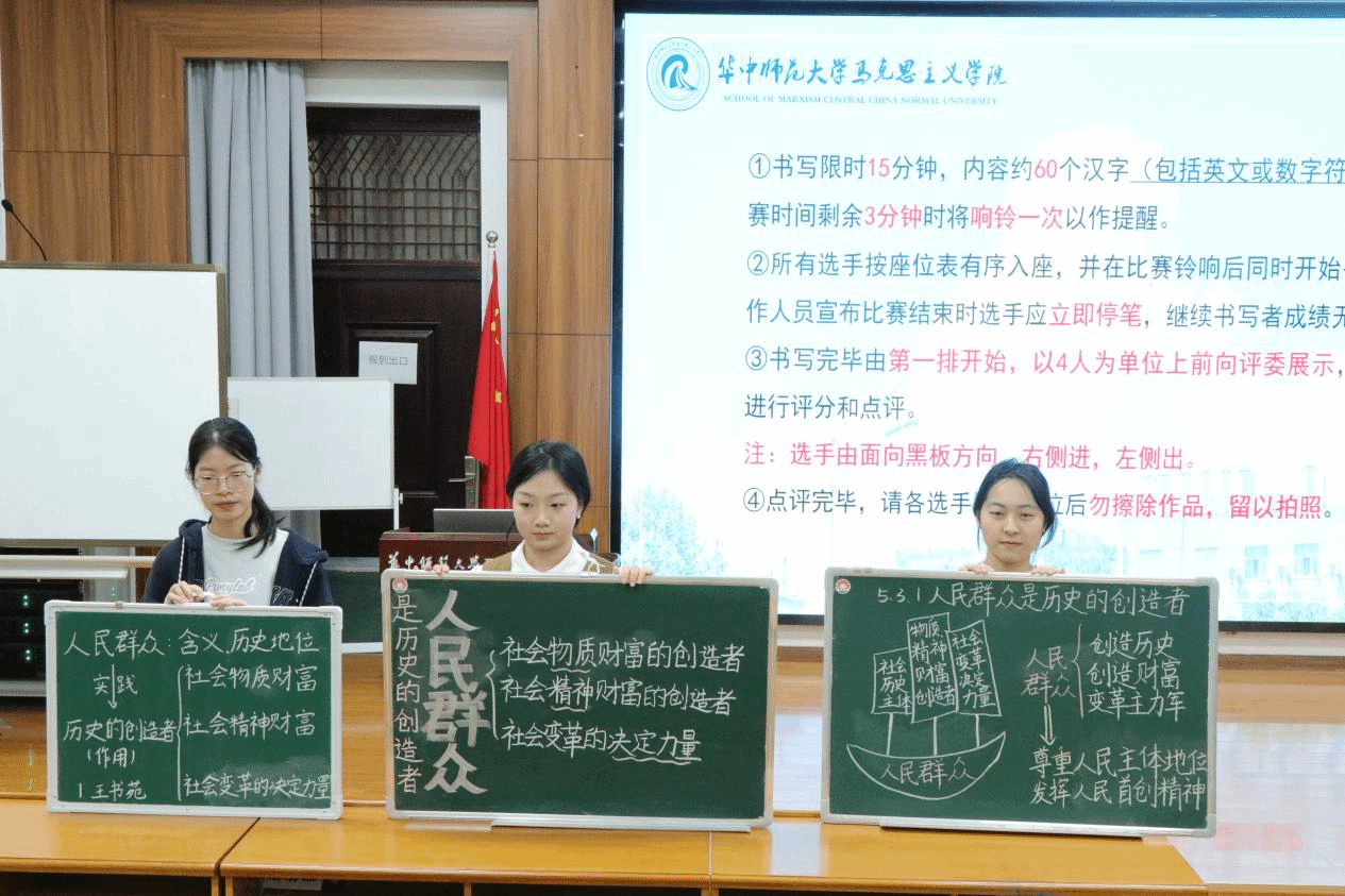 马克思主义学院讯(通讯员 李黄帆;摄影 吴金铭)4月8日下午,马克思主义学院于一号楼1101教室举行第十六届粉笔字板书设计大赛。马克思主义学院2022级本科生辅导员田聪娇,华中师范大学书写指导团成员张艺馨、常钰彤、龚若楹作为评委出席比赛。本次比赛由马克思主义学院团委、学生会师范生训测部承办,廖云欣任主持人。