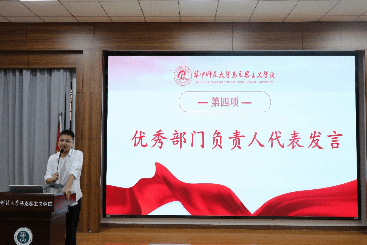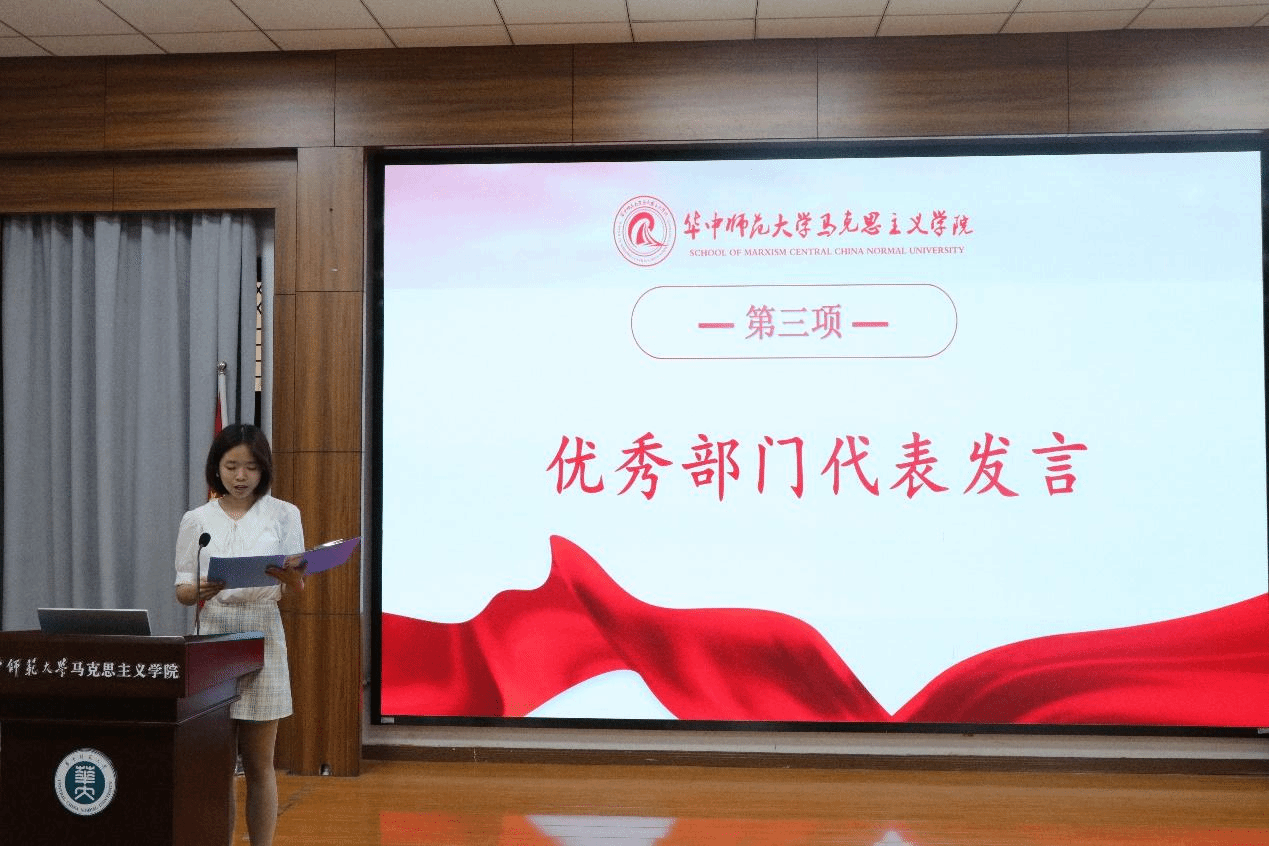 优秀部门代表文艺部负责人高菲向一年来所有支持文艺部的老师、团委、学生会成员表示感谢,表示文艺部始终致力于发挥同学们的想象力和创造力,以丰富学生们的校园生活,增添马院学子的生活乐趣为己任,举办各类文艺活动,彰显马院特色,组织协调活动排练,尽显马院学子风采。