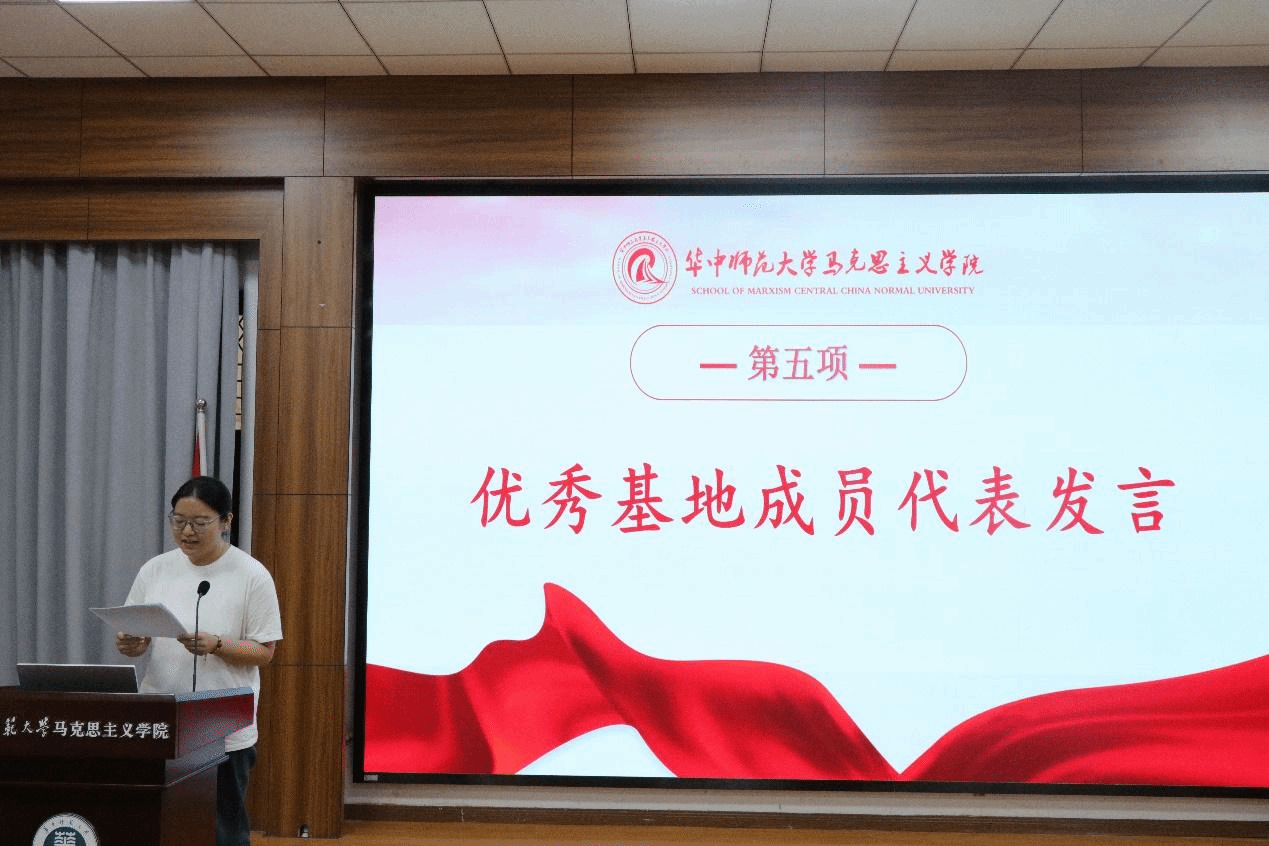 优秀基地成员代表刘一鸣分享了在团委、学生会工作的充实生活,从第一次统计数据时的手忙脚乱,到现在已经可以熟练地制作策划案;从第一次报账时的新奇,到现在的得心应手。“在团学我感受到了学长学姐的爱,感谢和小伙伴们的相遇,这一年来的收获远超期待。”她欣喜调研与培训中心这个小团队越来越默契,也真正感受到了马院家文化的魅力,希望马院团学联越来越好,每一位伙伴都可以在自己的领域闪闪发光。