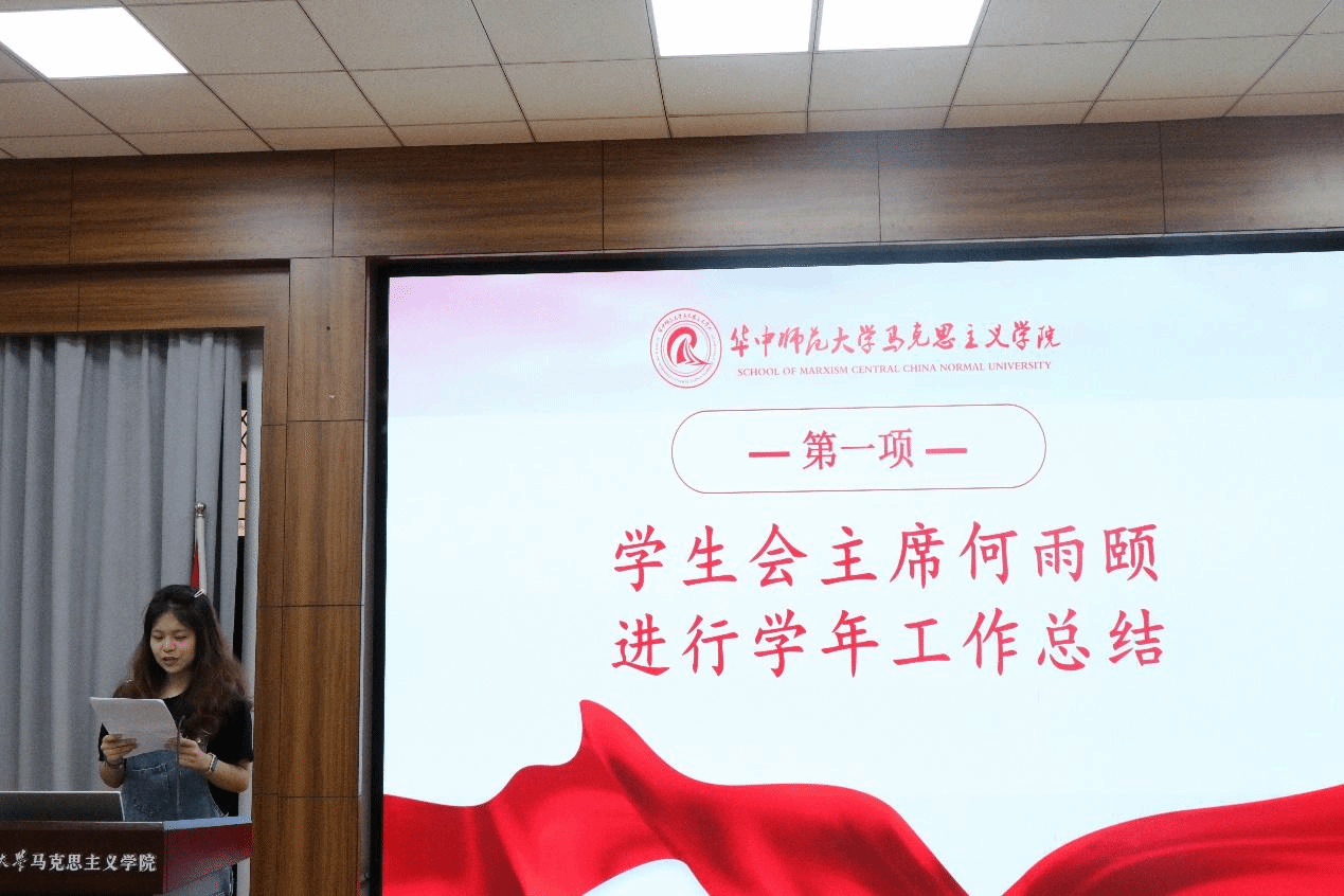 随后,何雨颐进行学年工作总结。她从暑期社会实践活动出发,回顾一年来团委、学生会走过的点点滴滴,历数本学年各部门的工作情况,肯定了每一位成员为马院团学联建设付出的努力,对马院团学取得的优异成绩表示祝贺。同时,也提出本学年工作的开展还存在时政意识不够强、活动的吸引力和影响力不够高、团学队伍战斗力有待加强等问题,并鼓励团学成员积极解决问题,更好地服务马院同学,勾画马院团委、学生会新蓝图。