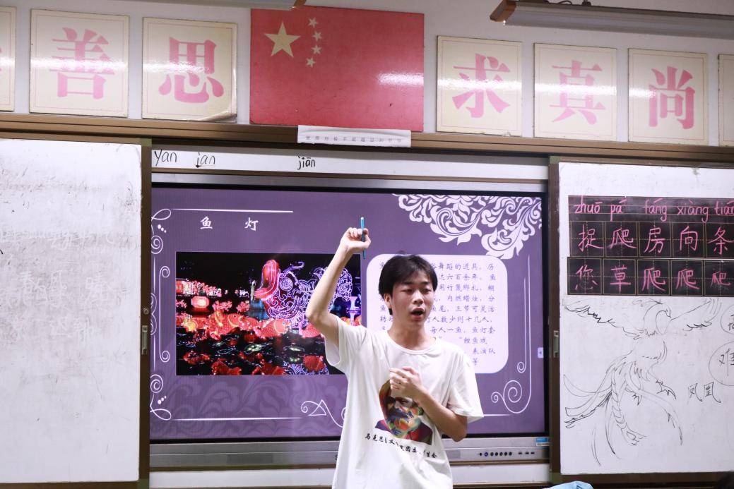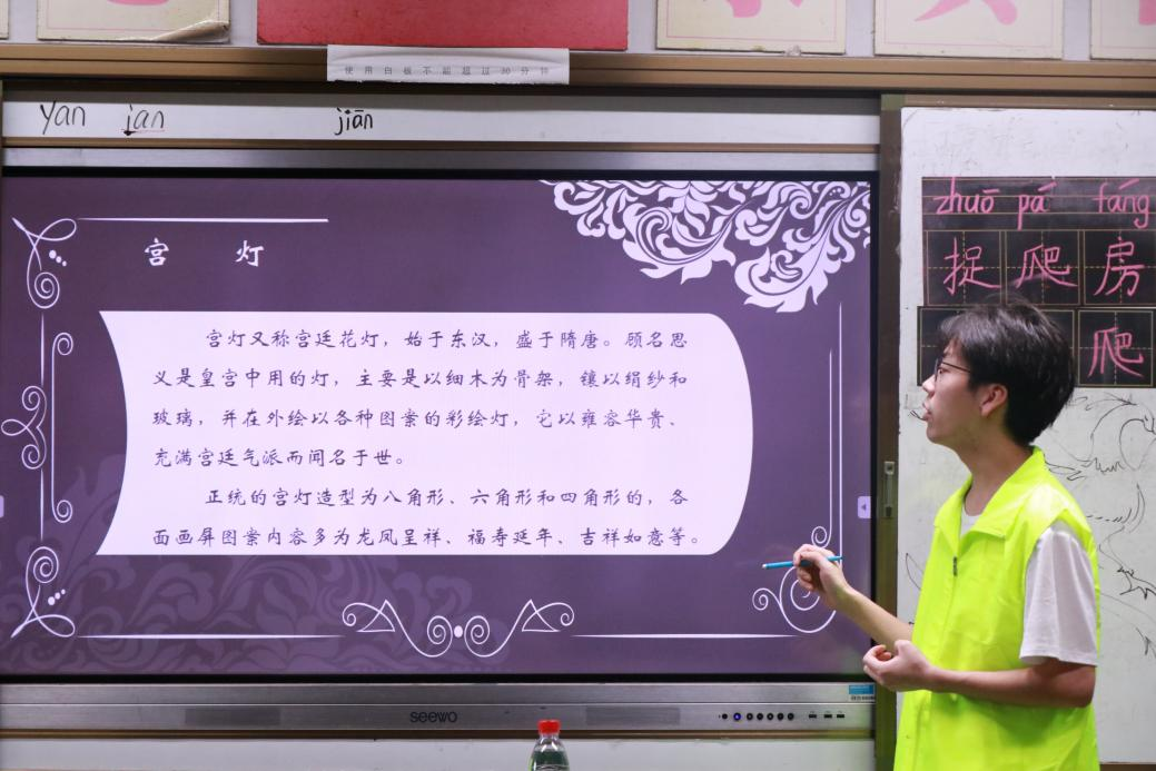 志愿者马冲以“什么是灯笼?”的问题为引,激发学生的讨论热情,并引导学生积极思考。他简单介绍灯笼的含义及由来,科普传统灯笼的种类,并重点介绍非物质文化遗产“无为剔墨纱灯”。最后,马冲带领同学们观看非遗传承纪录片,以一种更加生动的形式让同学们走近“无为剔墨纱灯”。在课堂互动环节,同学们积极踊跃地参与课堂讨论,并向志愿者提出疑问,表现出对我国非物质文化遗产的浓厚兴趣。