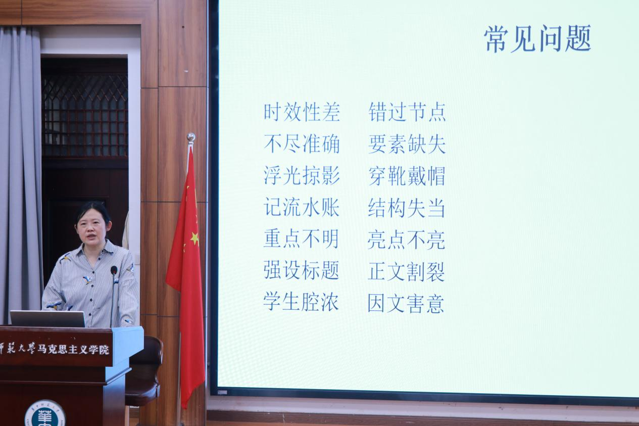 韩晓玲从学生新闻工作者常犯的错误入手,一针见血地指出新时代下的校园新闻写作存在时效性差、记流水账、因文害意、亮点不亮、重点不明等问题。她结合以往新闻撰写中出现的错误,强调校园新闻写作应当言之有物、力求准确、重点突出,且新闻发表的时间节点应当合理。她以《“校园调研大赛”中的“学生问政环节”》《“最美基层就业毕业生事迹报告会”中两个感人事迹》两篇优秀新闻稿为范例,强调写新闻稿切忌堆砌素材,不能对每个要记录的事件均匀用力,要从“小切口”中以小见大,突出新闻稿的亮点。