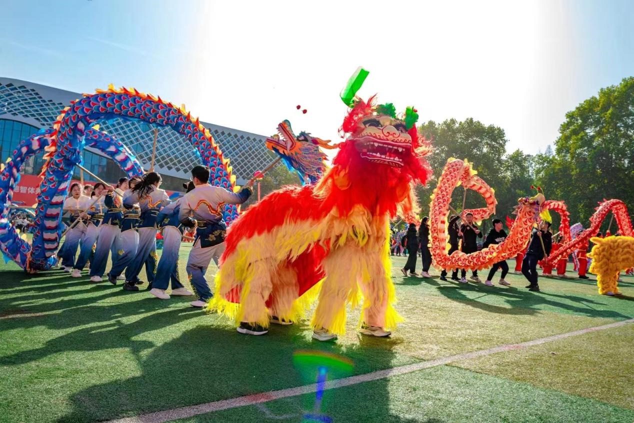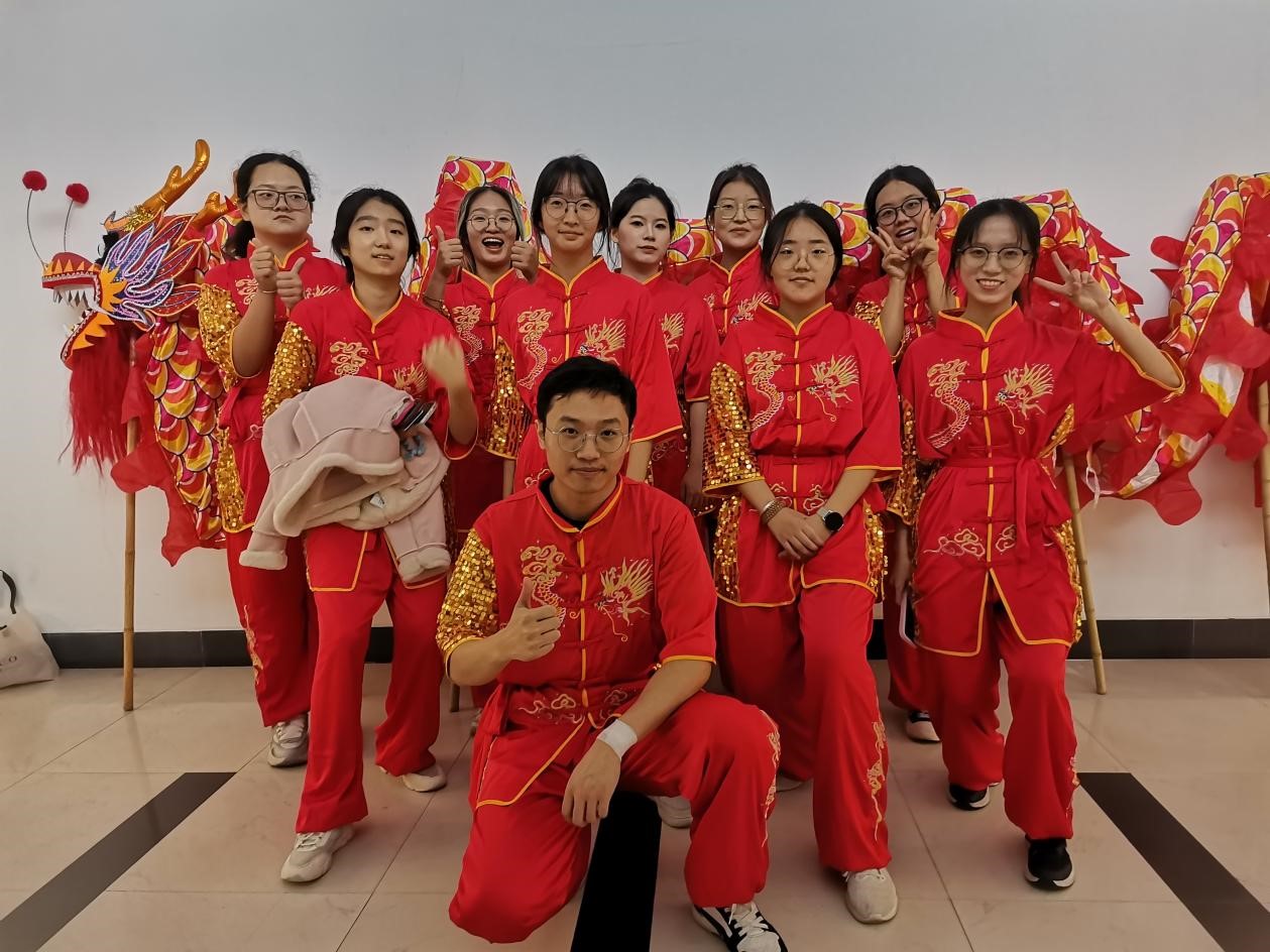 接下来进行的是舞龙舞狮表演,马克思主义学院舞龙队由12名成员组成,包括一名龙头(男)、八名龙身(女)及三名替补龙身(女),曾获华中师范大学2023年校运会自选舞龙三等奖。经过两周的刻苦训练,舞龙队员们热情奔放、技艺娴熟,动作刚劲,表演灵活多变,舞出华师风范。