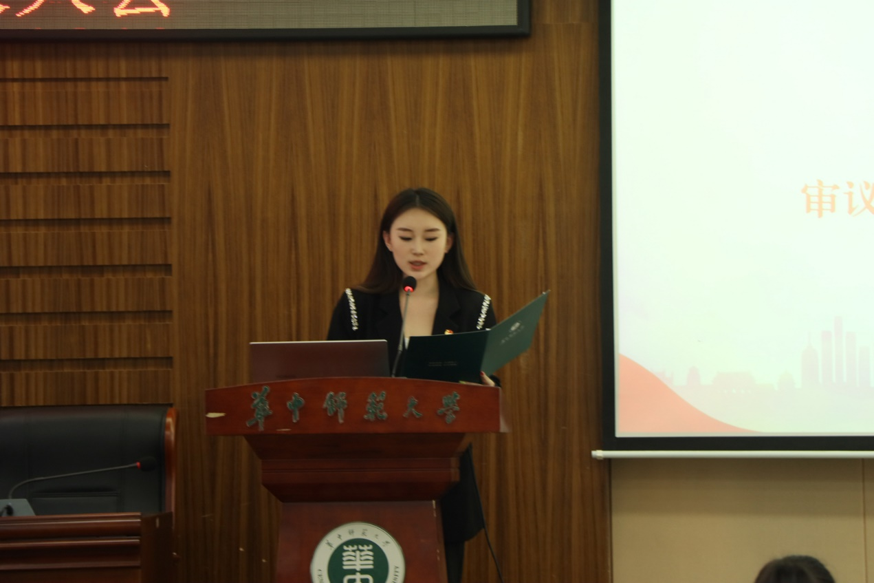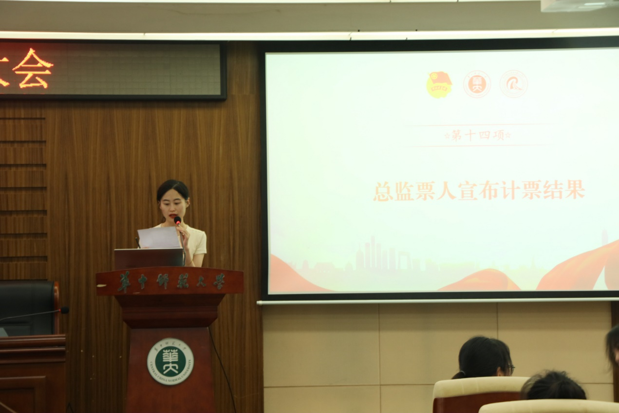会议的最后,团委书记、大会总监票人李欣宣布计票结果并致辞。她希望新一届的团委、学生会能不忘初心,奋楫笃行,自觉打造思想觉悟高,业务能力精的团学组织,服务青年,引领青年,推动学生工作再上新台阶。会议在庄严的团歌中闭幕。