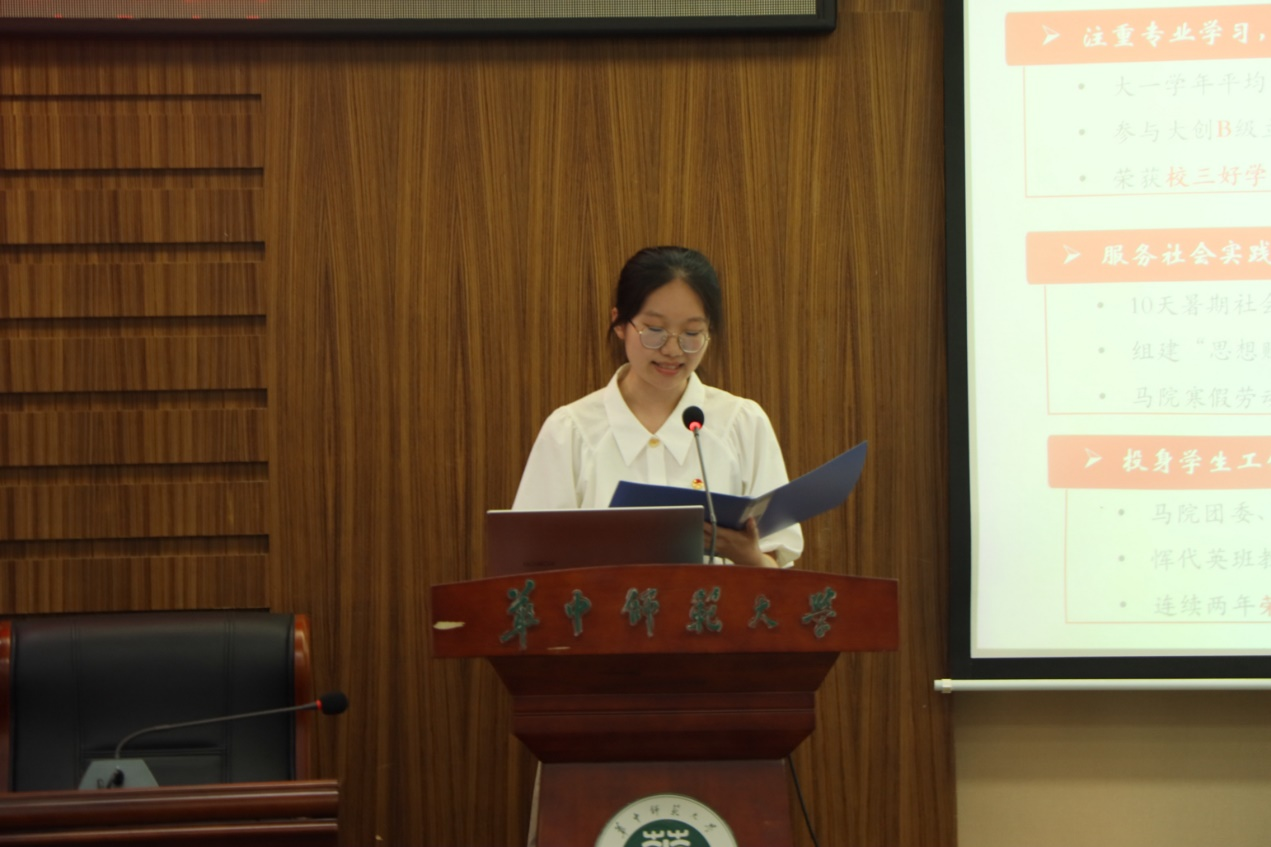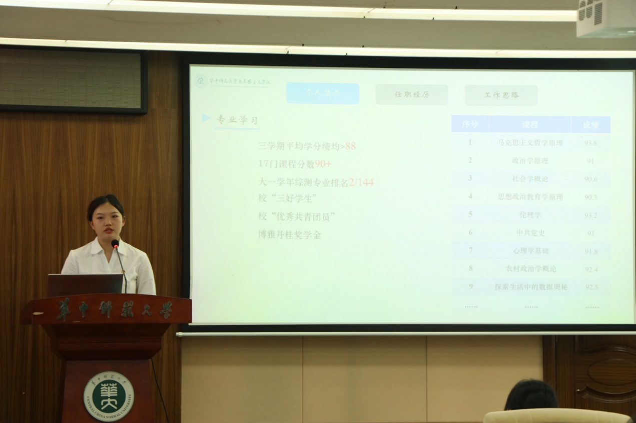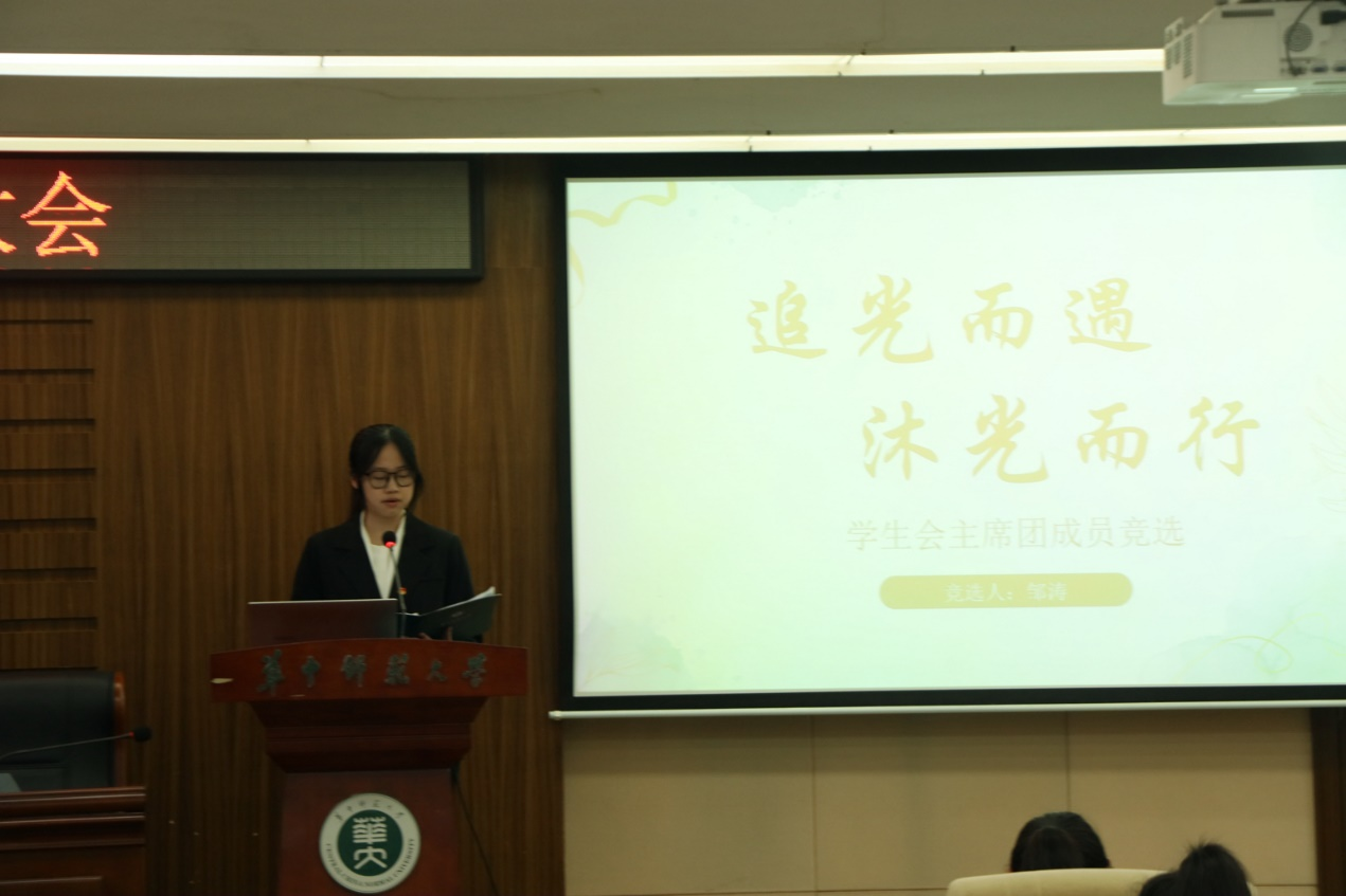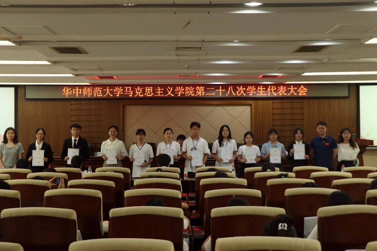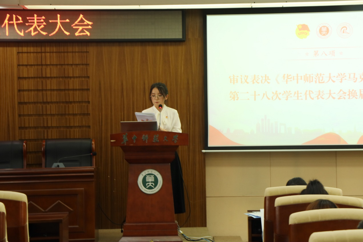 大会第三项,选举产生华中师范大学马克思主义学院第二十八次学生代表大会学生委员会,候选人为王丹琳、王尔琪、王媛媛、邹涛、崔粲、雷舒涵和黎志祺。七位候选人结合自身履历,从个人简介、工作经历和未来规划等方面进行竞选演讲。演讲结束后,与会代表按照《华中师范大学马克思主义学院第二十八次学生委员会委员选举办法》有序进行投票。