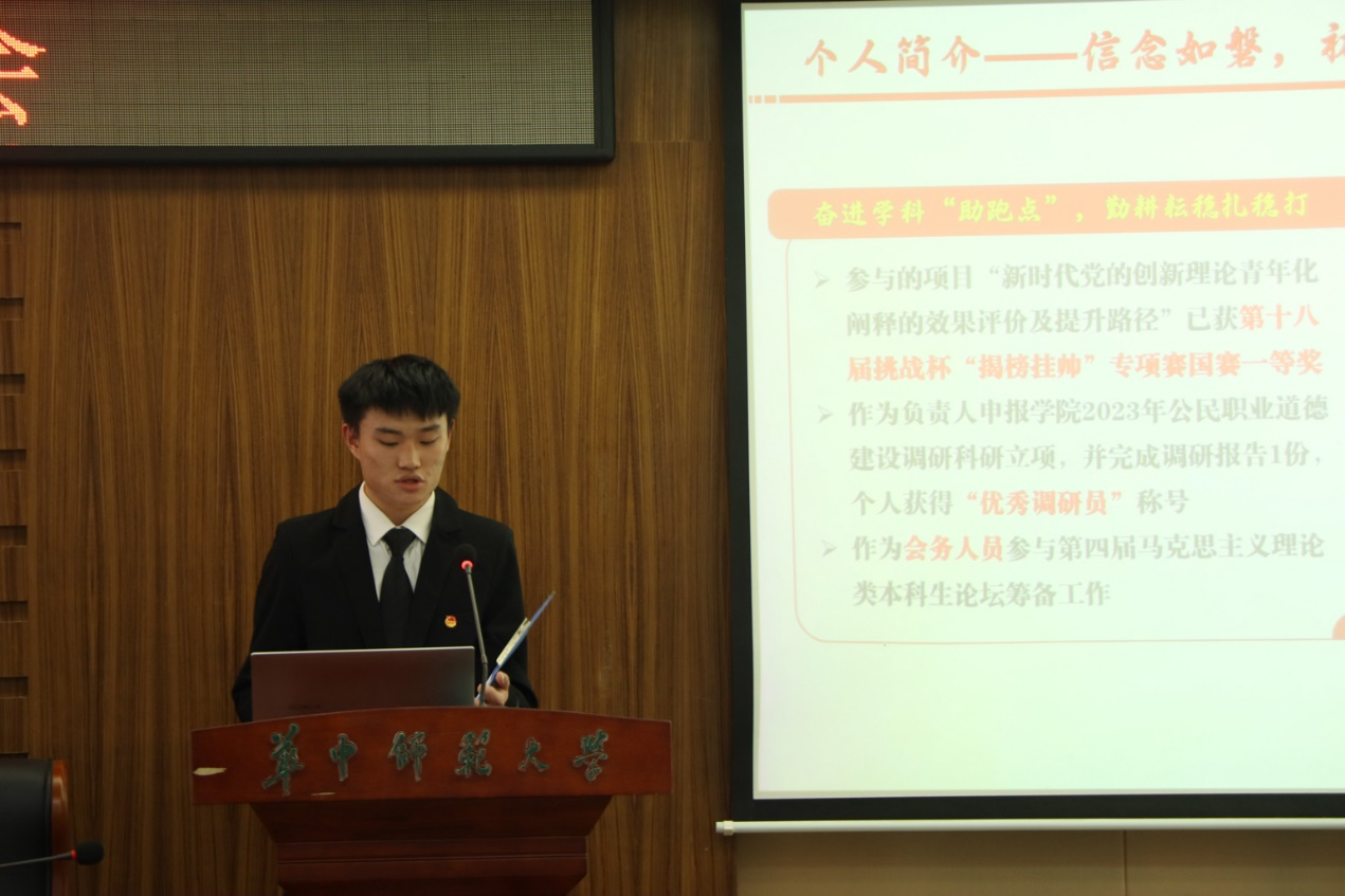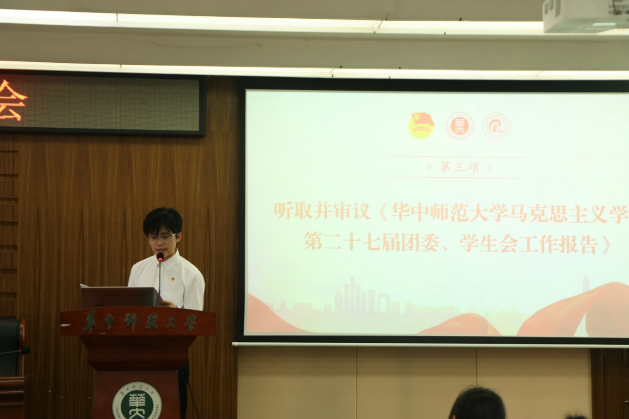 大会第二项,学生会执行主席周宗伟作《华中师范大学马克思主义学院第二十七届团委、学生会工作报告》。报告深入贯彻党的二十大、两会精神,回顾总结过去一年团学工作的成绩,结合国内外和新时代青年发展新形势,深入分析团学工作肩负的新使命、面临的新机遇和新挑战,锚定我院一流学科建设和全国重点马院建设的目标,号召全院青年展现青春作为,贡献青春力量。