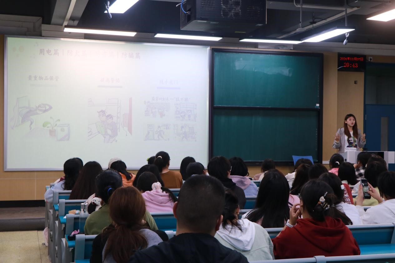 寝室安全防范同样不容忽视。邵梓涵从用电、防火、防盗、防骗四个板块分别进行介绍,她以往年宿舍因使用违规电器导致断电停电的案例让在场同学真切感受到了注意寝室安全的重要性,有效提高了同学们的防范意识。