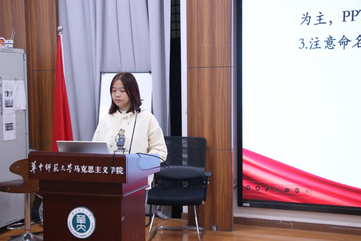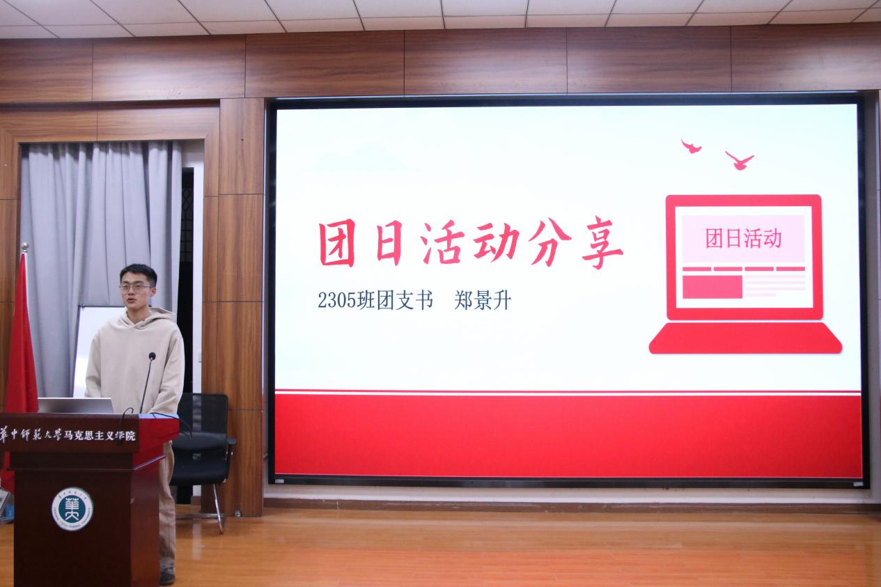 为提升各团支部团日活动质量,本科2301班团支书王潮、2023—2024学年本科2023级团总支副书记郑景升依次上台进行团日活动经验分享。王潮从活动前、中、后期阐明如何开展团日活动,强调应注重团日活动主题的时效性和新颖性,接着他从主题、形式、参与度、分工四个方面进一步讲解了如何将团日活动办得更好。郑景升指出年级团日活动应具备统一性、教育性、时代性等特点,并从结合活动主题做好活动内容、结合自身专业优势讲好优秀的思政课以及竭诚服务好同学等方面为团日活动的开展提出建议。