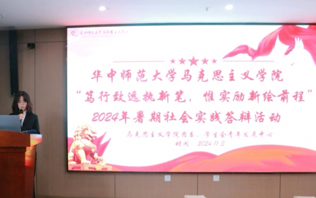 马克思主义学院讯(通讯员 冯代昕;摄影 杨淑睿)11月3日下午,华中师范大学马克思主义学院“笃行致远执新笔,惟实励新绘前程”2024年暑期社会实践答辩活动在文科综合楼407会议室举办。马克思主义学院副院长邵彦涛、团委书记李欣、2022级本科生辅导员高源、2024级本科生辅导员赵芸逸担任本次活动评委。活动由马克思主义学院团委、学生会青年发展中心主办,青年发展中心成员李一凡担任主持人。