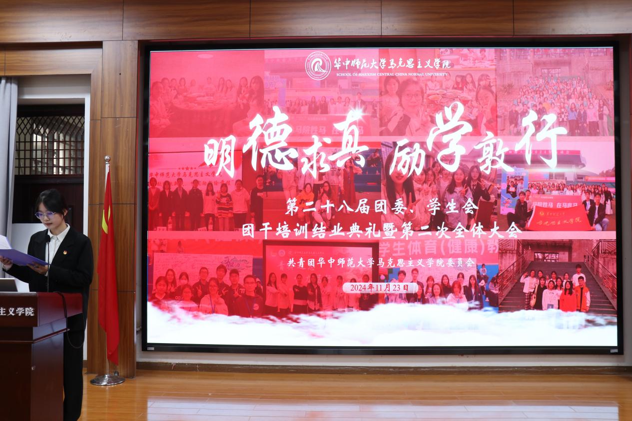 马克思主义学院讯(通讯员 冯代昕)11月23日上午,马克思主义学院“明德求真,励学敦行”第二十八届团委、学生会团干培训结业典礼暨第二次全体大会在一号楼1101教室举行。马克思主义学院(以下简称“马院”)团委副书记赵芸逸出席本次大会,权益与调研中心成员余飞飞、办公室成员黄欣蕊主持本次会议。