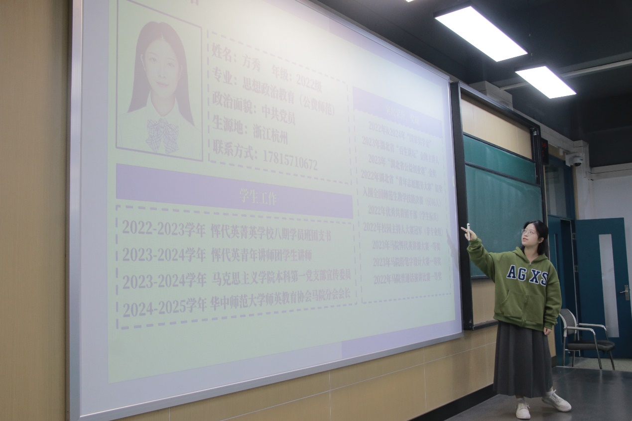 方秀以“懂道理又会讲道理——争做卓越思政教师”为主题展开经验分享。她强调,作为思政教育的后备力量,马院学子们不仅要从基础知识的构筑上做好高中政治教材与大学专业课程的链接,还要在师范能力的塑造上达到知识、技能与情感态度价值的统一。她通过时间思维的延伸,为同学们在校四年的目标与规划提出精准且详细的建议,鼓励同学们前期大胆尝试不同的可能性并锚定前进的目标,后期则将更多的精力投入集中训练与一线实践,厚积薄发、一鸣惊人。