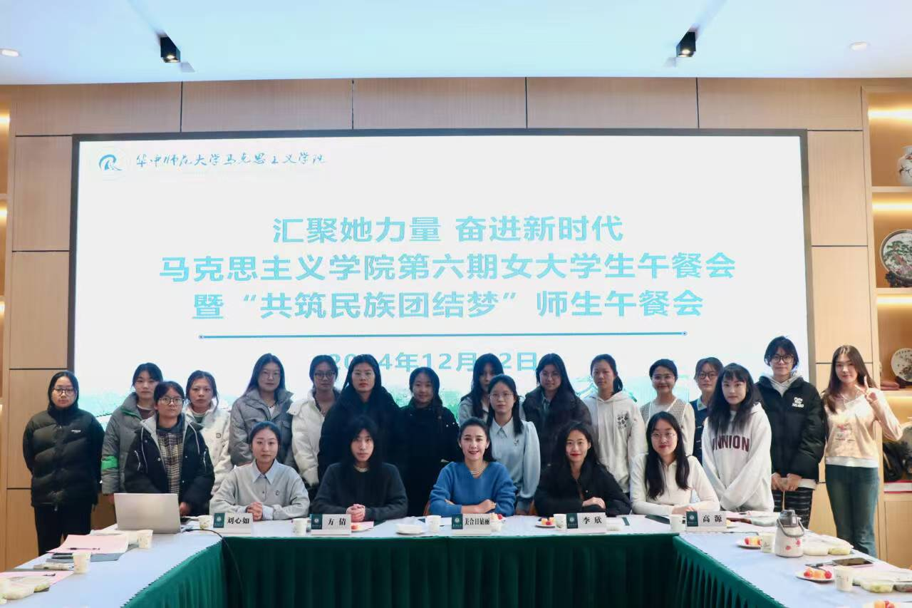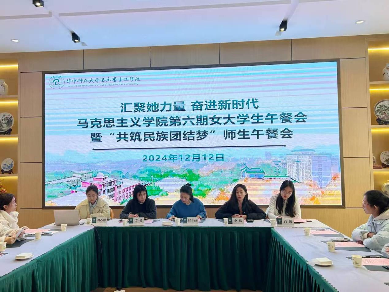马克思主义学院讯(通讯员 李欣 任玉佳;摄影 潘依依)12月12日,马克思主义学院第六期女大学生暨“共筑民族团结梦”师生午餐会在桂香园食堂3楼桂花厅举行。校党委学工部民族团结教育办公室职员美合日姑丽·阿不都外力,我院团委书记李欣,辅导员高源、方倩、刘心如出席。活动由团委书记李欣主持。