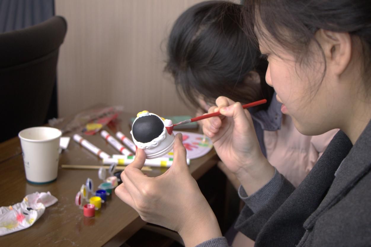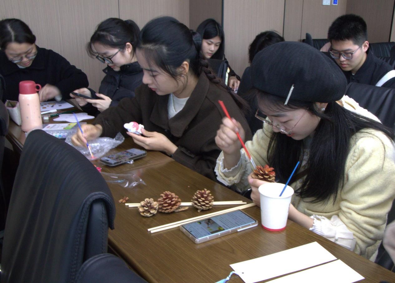 活动开始,在场同学平均分为十二个小组,他们合理分配各种工具,小组合作进行DIY手工制作。文艺部工作人员在旁悉心提示,耐心解答同学们的疑问,并为同学们补充画笔、纽扣等材料。在制作松果花束、石膏娃娃的过程中,同学们热情满满、跃跃欲试,各个小组之间调配交换颜料,互相帮助,顺利完成一件又一件设计。