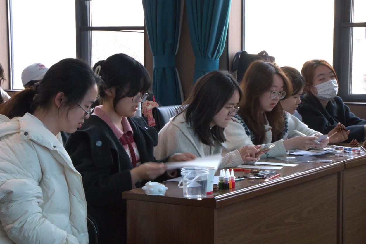 活动由文艺部成员刘思妍担任主持人,刘思妍为大家介绍了此次活动内容,包括纽扣画、大漆书签、松果花束、石膏娃娃DIY等一系列项目。在活动正式开始前,刘思妍提醒同学们在活动过程中要注意清洁卫生和操作方式,避免材料沾染衣物、桌面。