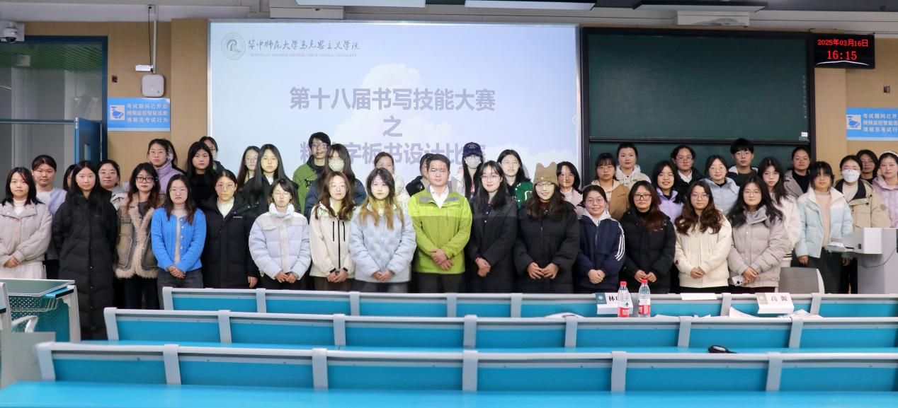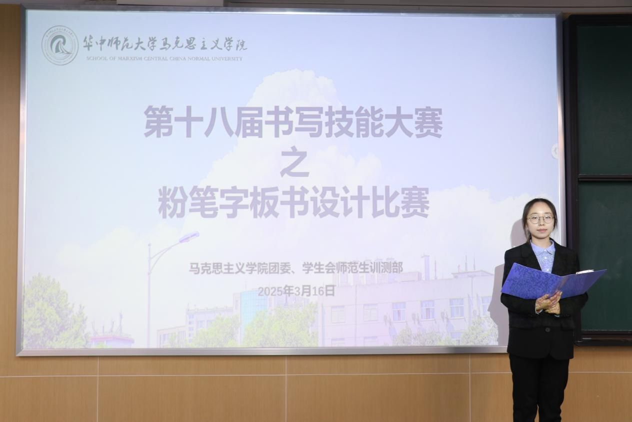 马克思主义学院讯(通讯员 冯代昕)3月16日,马克思主义学院(以下简称“马院”)第十八届粉笔字板书设计比赛在八号楼8511教室举行。马克思主义学院2022级本科生辅导员高源,2024级本科生辅导员赵芸逸,华中师范大学书写指导团成员陈蓝珺、林璐萍出席本次比赛并担任评委。本次比赛由马克思主义学院团委、学生会师范生训测部承办,师范生训测部成员胡冉担任主持人。