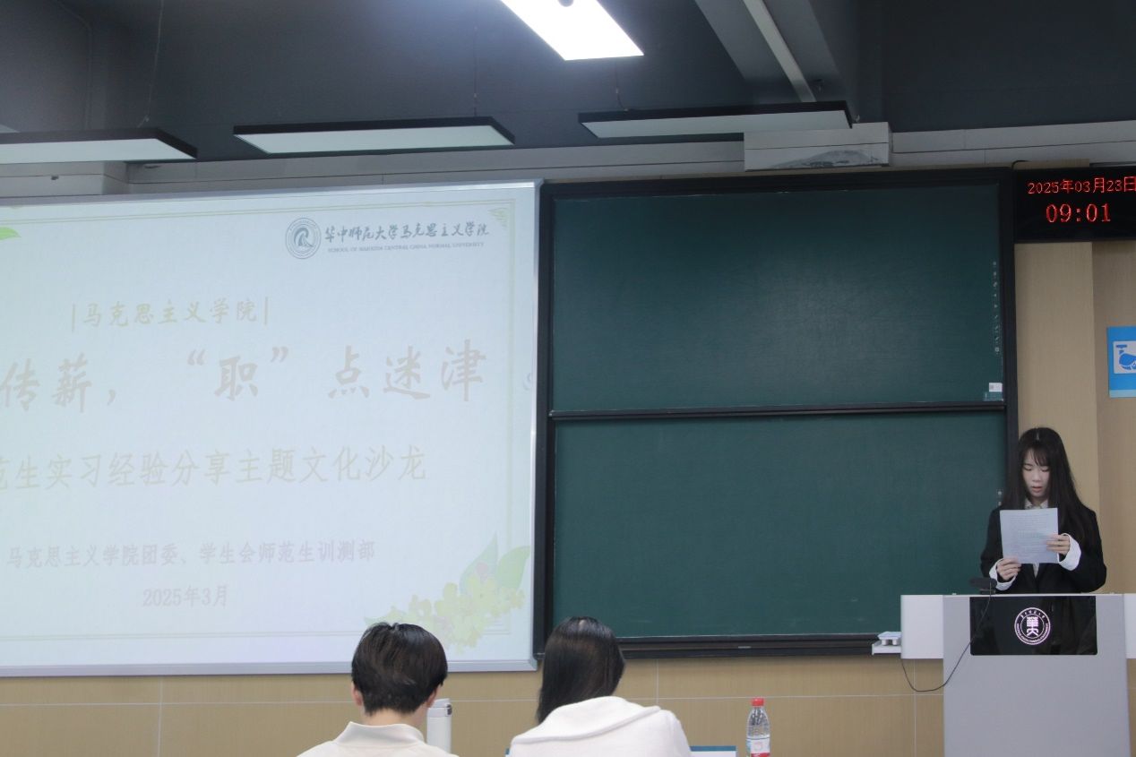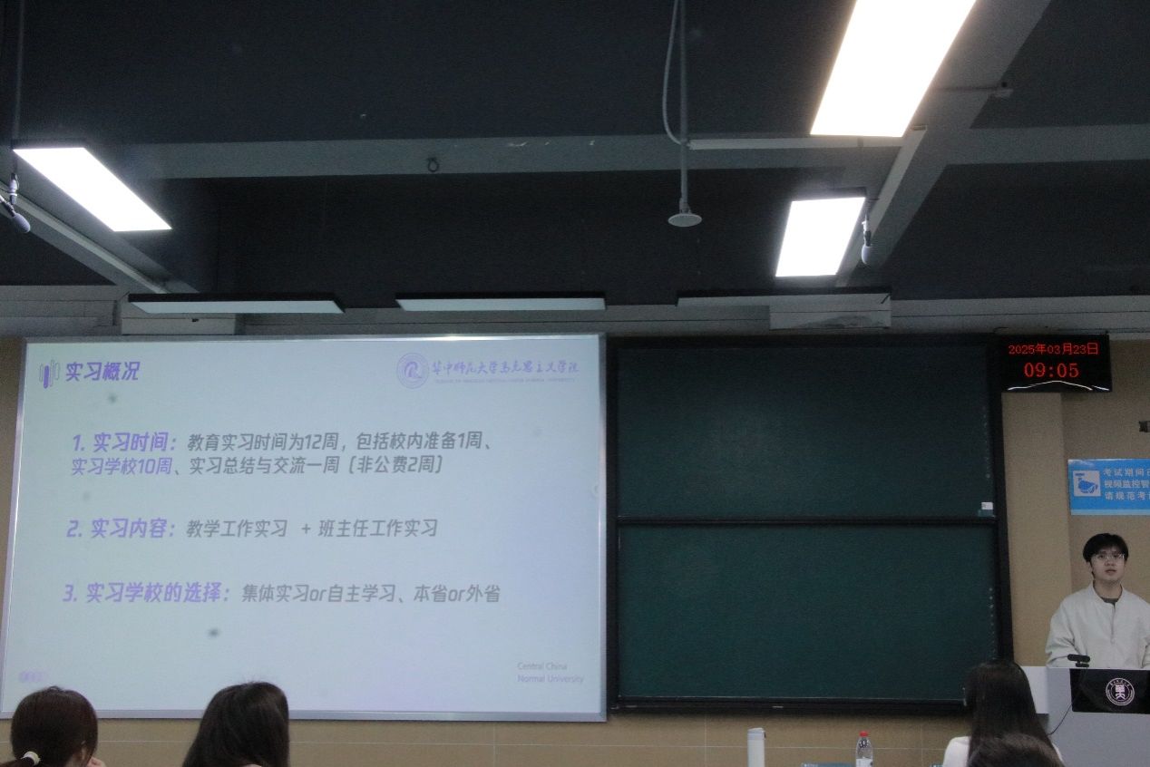 马克思主义学院讯(通讯员 陈国越)2025年3月23日,华中师范大学马克思主义学院“师语传薪,‘职’点迷津”师范生实习经验分享文化沙龙活动在八号楼8511教室开展。本次活动由马克思主义学院团委、学生会师范生训测部举办,马克思主义学院2021级本科生周宗伟、邱子芯担任主讲人。本次活动聚焦于实习经验分享,旨在助力师范生进一步了解教育行业,提升职业素养,为未来投身教育事业做好充分准备。