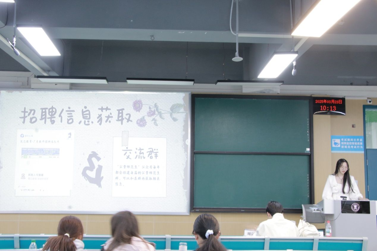 紧接着,邱子芯上台分享。她从实习权衡、实习流程、学习途径及人际关系处理等维度展开讲解。她指出,师范生们在实习前需明确是选择集体实习还是自主实习,这一决策将影响后续的实习体验。她强调在实习期间恰当处理与学校职工、学生家长及其他实习老师关系至关重要,并据此给出诸多有益建议,帮助同学们在未来实习期间维系良好的人际关系。此外,邱子芯还分享了众多招聘信息获取渠道和实用的招聘小技巧,并针对同学们提出的各种问题给出了细致的解答。