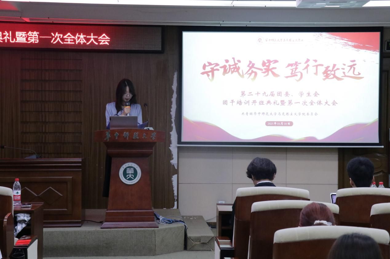 马克思主义学院讯(通讯员 聂琬婷;摄影 王思齐)10月18日上午,马克思主义学院(以下简称“马院”)第二十九届团委、学生会团干培训开班典礼暨第一次全体大会在逸夫国际会议中心一楼报告厅举行。马院党委副书记邵莉莉、团委书记李欣、第一团委副书记郭爽爽、第二团委副书记陈佳韵、第三团委副书记王冰洁、学生会执行主席司陈雨出席本次会议,学生会主席团成员张书萌主持本次会议。