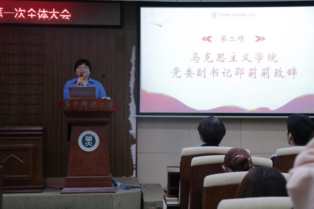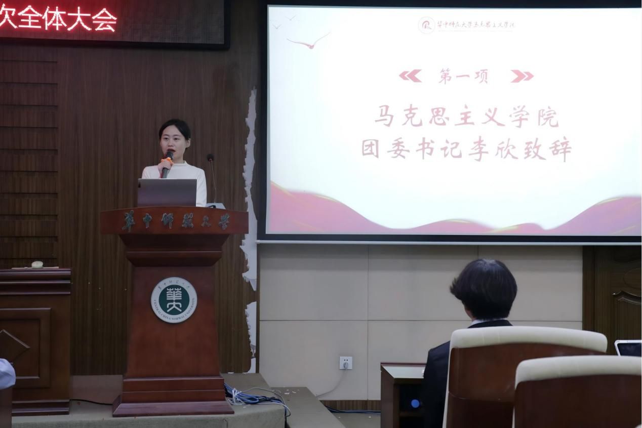 邵莉莉在开班典礼致辞,肯定了马克思主义学院团委、学生会过去一年的成绩,鼓励新成员向学长学姐取经进步。她强调,同学们要培养精益求精的工匠精神,不忘初心;增强思想政治引领力,践行“在马言马、在马信马、在马行马”,为团学工作刻下鲜明的红色印记。