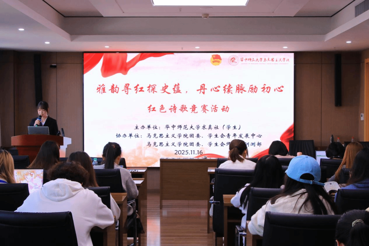 马克思主义学院讯(通讯员 李江彤)11月16日,华中师范大学马克思主义学院“雅韵寻红探史蕴,丹心续脉励初心”红色诗歌竞赛活动在文科科研楼407会议室举行。本次活动由华中师范大学求真社(学生)主办,马克思主义学院团委、学生会青年发展中心和师范生训测部协办。青年发展中心成员豆可馨主持本次活动。