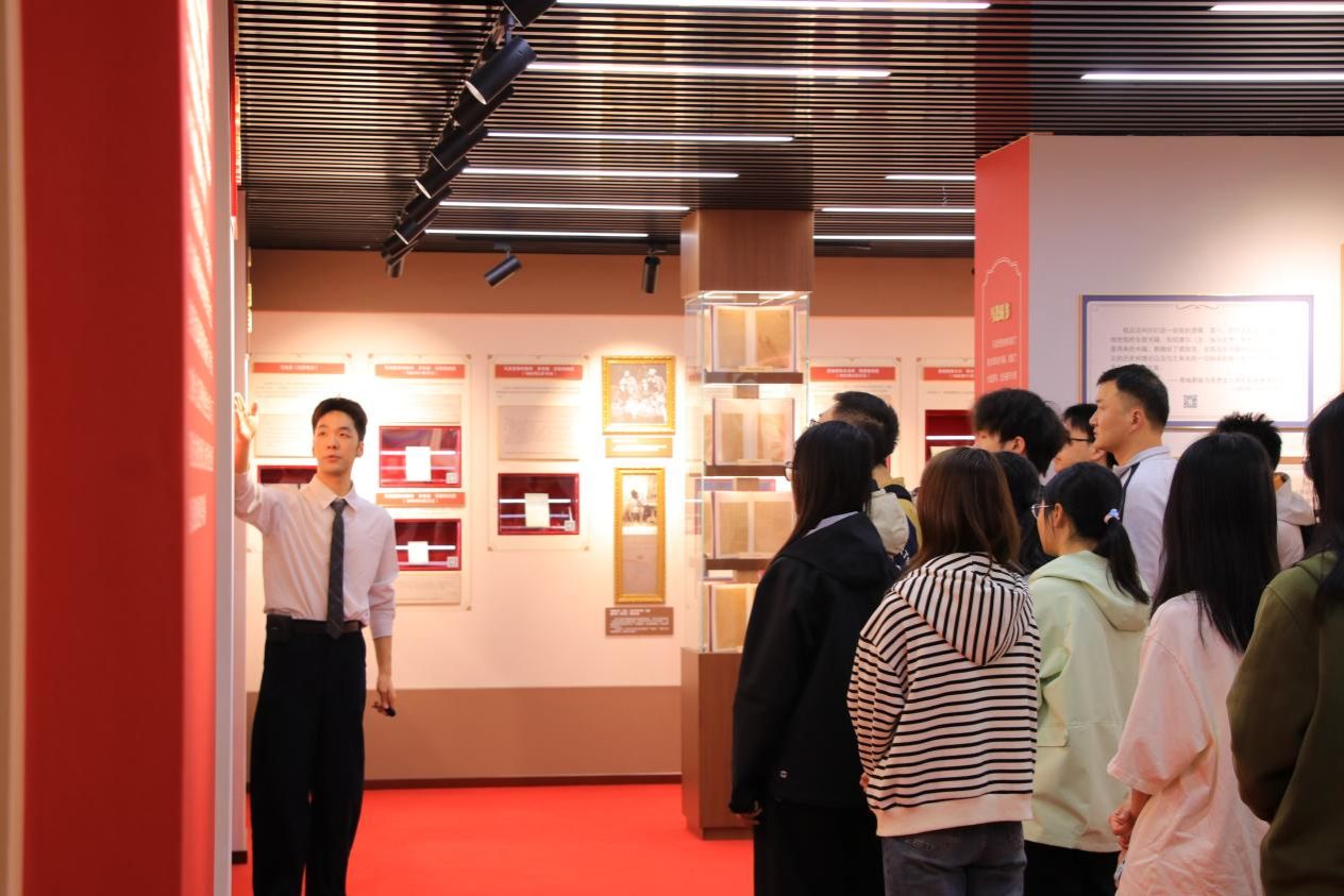在文献典藏展参观环节,同学们在讲解员的带领下有序观摩、静心研习。大家近距离阅览各类马克思主义珍贵文献典藏,详细了解不同文献的创作背景、版本沿革与历史意义。同学们积极驻足研读、交流探讨,在史料中追溯马克思主义的发展脉络,直观感悟经典著作的思想深度与历史厚重感。
