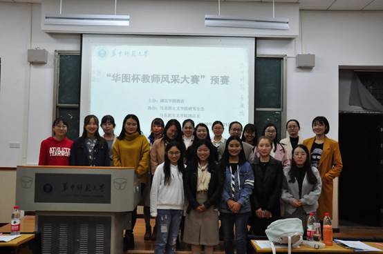 马克思主义学院讯(记者 冯宇;摄影 唐慧)为了提升我校师范生的教学技能,促进同学们更好地将理论知识运用于实践教学当中,10月21日14时,由湖北华图教育主办、马克思主义学院协办的“华图杯”教师风采大赛预赛于一号教学楼1114和1222教室顺利举办。担任本次比赛评委的是华图教育的专业老师以及学院研究生会和团总支的部分负责人。参赛选手主要是来自于马克思主义学院的硕士研究生,另外也有来自我校体育学院、教师教育学院、语言研究所等院系的同学。