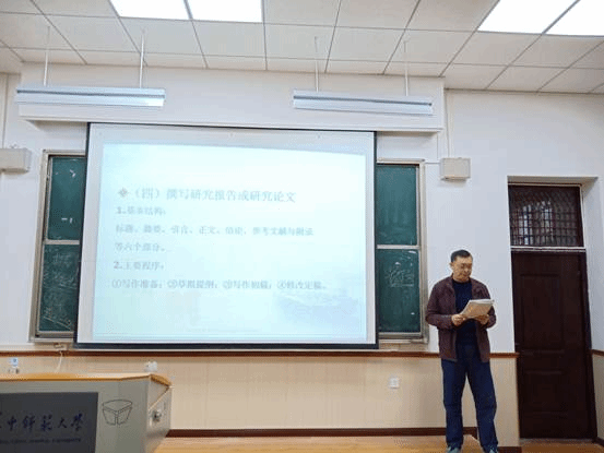 第三,搜集整理资料。陈华洲教授从搜集整理资料的意义谈起,他认为搜集资料是科学研究的基础性工程,是科学研究取得成功的保证。搜集资料可以使我们避免从事无效的重复劳动,了解有关课题的现有研究成果,并以此作为自己的研究起点。第四,撰写研究报告或研究论文。陈华洲教授具体介绍了撰写论文的主要程序,包括写作准备、草拟提纲、写作初稿及修改定稿等。紧接着,陈华洲教授介绍第五步骤,验证评价研究成果。其中包括组织鉴定、投稿报奖、实践检验和反馈开新四部分。