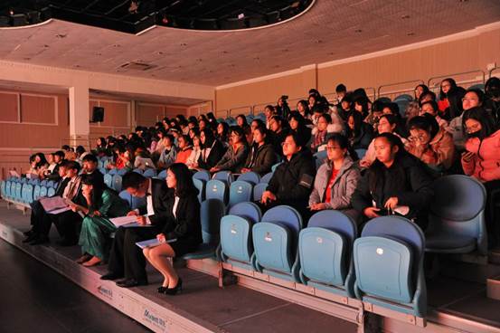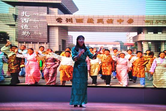前面的同学为我们展现了中华民族40多年的奋斗史与成就史,下面由德西卓嘎带来的《高原礼赞·改革开放四十周年》则从少数民族视角出发让我们了解不一样的中国。“有国才有家,守护祖国高原上的一草一木,情系雪域,爱满高原”是少数民族对祖国的心声。德西卓嘎从自身角度出发唱出了西藏人民对祖国的赞扬。背景图片上展现了藏族生活的改变和藏族人民的幸福,她的歌声中洋溢着满足感,这是来自高原的礼赞。