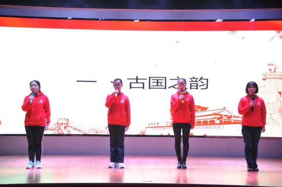 以人为本,大业昌隆;共建和谐,中国富强!第一个节目是由李林萱等人带来的情景诵读《辉煌啊,我的国》。她们演绎的“孔子课堂”、“恽代英被囚”和“古今对话”的情景剧展现了从古国之韵到改革之耀的中国历程。接着在朗读阶段以“美哉,我少年中国,与天不老!壮哉,我中国少年,与国无疆”作为结尾鲜明的体现了“辉煌啊,我的国”的主题。