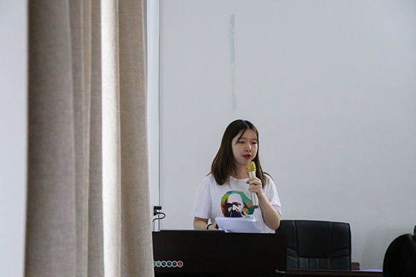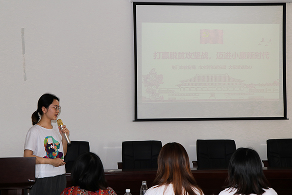 田雨馨通过“五个一批”、“三位一体大扶贫格局”等五个关键词阐述了脱贫攻坚的重点工作。她以鱼池村依托东林服装厂建立扶贫车间为贫困户提供40个就业岗位为例,讲述了鱼池村近年来在产业扶贫道路上取得的成就。“一改二化三园”的人居环境整治更体现了鱼池村为响应生态补偿脱贫做出的努力。在讲述发展教育脱贫的重要性时她结合青马红心实践团于全坑小学开展的支教工作表明了柴湖镇对教育的重视。