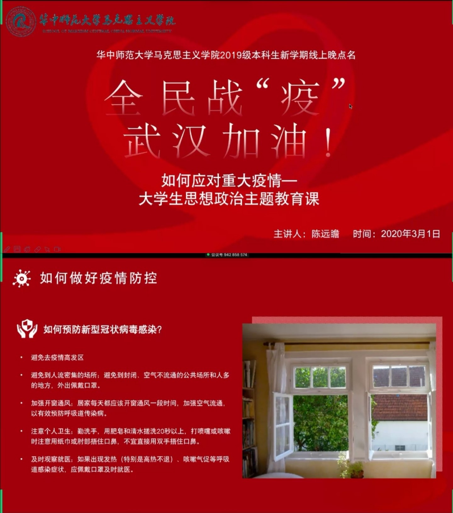 陈远瞻首先以“全民战‘疫’,武汉加油——如何应对重大疫情”为主题,从“什么是新冠肺炎”、“疫情带来的影响”、“如何做好防控”以及“大学生面对疫情的‘四个方面’教育”入手,讲授了新学期的第一节大学生思想政治主题教育课。他呼吁同学们,面对疫情,我们要爱党爱国,坚定信心;面对舆论,要调整好心态,理性对待;同时,要尊重生命,追求健康。在听课过程中同学们也纷纷留言,“加油武汉!加油桂子山!”,“不造谣、不传谣,在疫情期间做合格的大学生!”……一系列的课堂互动展现出了2019级本科生对战疫必胜的信心以及对自己负责、对社会负责的责任与担当。