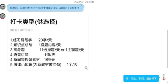 基于原有“团支部+”模式,学院2017级本科生线上建立专业学习、兴趣发展、习惯养成、社会服务等各类线上打卡互助监督小组。小组通过线上班会建立,辅导员赵芸逸采用一对一咨询的形式,了解学生思想动态,解决现实困难。共成立13个线上打卡小组,在满足学生个性化发展的同时,引导学生培养良好学习、生活习惯,避免学生陷入“因宅而肥,因肥而废”的状态,以夯实疫情防控期间的学生思想政治教育工作。线上打卡的监督互助形式,巧妙借助支部原有资源,显著增强思想政治教育的育人实效,更进一步提升学生对防控疫情、度过难关的坚定信念。