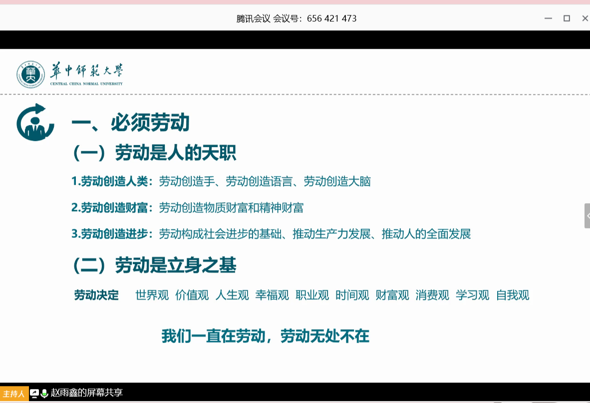 最后,赵雨鑫同学做总结发言。她从“必须劳动”、“有效劳动”、“投入劳动”三个方面讲解了劳动的必要性和重要性,提出如何开展有效劳动,并号召同学们崇尚劳动、尊重劳动者、积极投入到劳动中去,用新时代大学生的劳动践行“忠诚博雅、朴实刚毅”的华师精神。