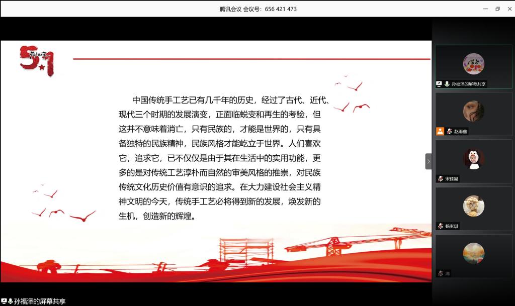 在帮助父母做家务劳动之外,许多同学还延伸了“劳动”的意义和形式。其中,孙福泽将“劳动”与传统文化相结合,通过采访非物质文化遗产满族荷包继承人,在亲身实践中体悟劳动教育,传递文化精神。除了“体力劳动”,陈雨茗居家期间,也将“脑力劳动”的作用发挥到了极致。她拾起高中数学知识,为高三学子答疑解惑,在线上的志愿服务中感受到了劳动的重要价值。随后,在主持人的带领下,同学们又分享了防疫劳动事迹,并观看了相关视频。