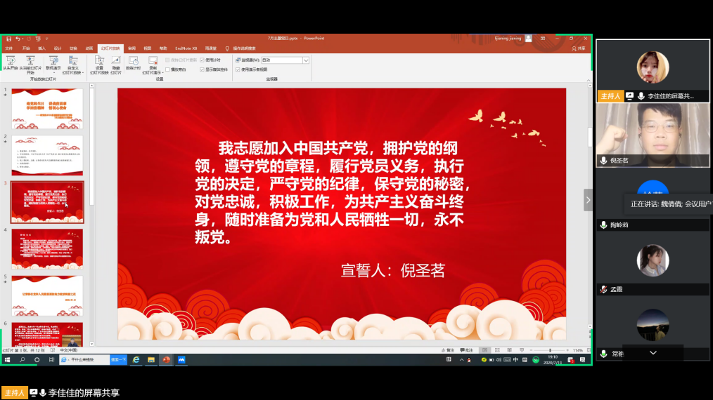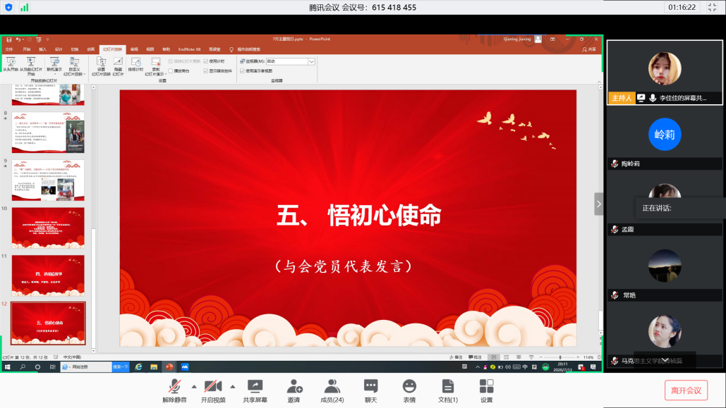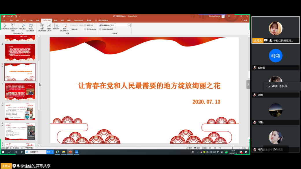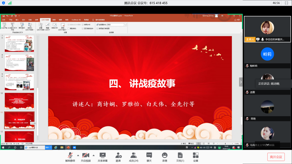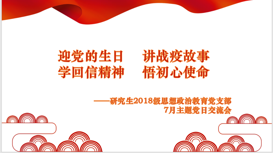 马克思主义学院讯(通讯员 陶岭莉)7月13日,“迎党的生日 讲战疫故事 学回信精神 悟初心使命”主题党日活动在腾讯会议室召开,我院研究生2018级思想政治教育党支部全体党员参加。党支部书记李佳佳主持会议。