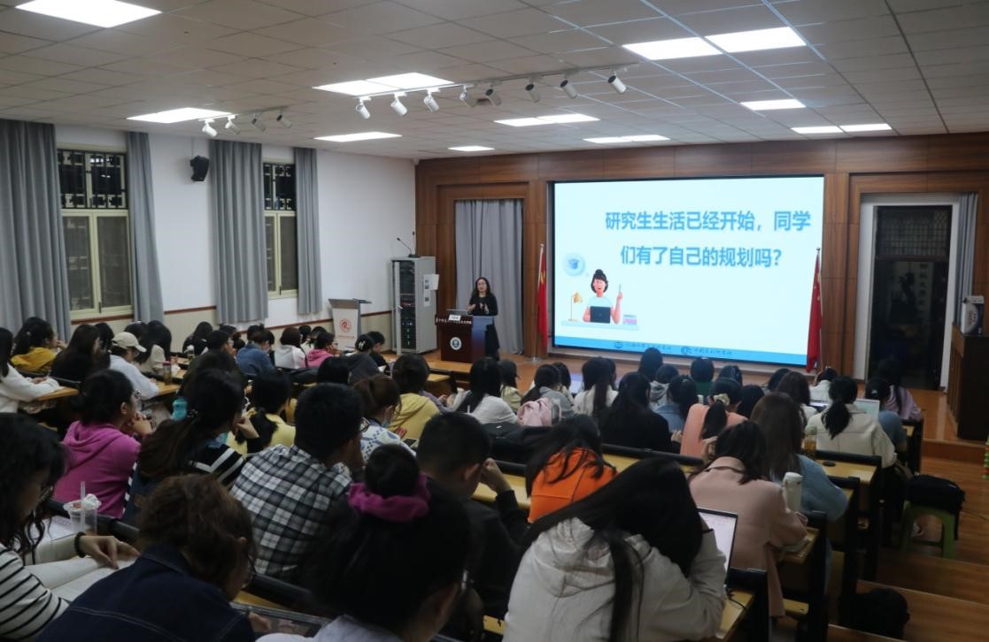 会上,肖盼晴副教授从学生当前所面临的“内卷”与“躺平”并存的时代背景引入,询问在场同学“是否在‘内卷’与‘躺平’的交织中感到迷茫?”,打开了师生交流的“话匣子”。破冰结束后,讲座正式进入主题,肖盼晴副教授分别从“为什么选择考研”、“研究生应该具备怎样的素质”、“如何进行课题研究”、“如何进行学习规划”等模块进行讲述。首先,她问及同学们的考研原因,针对同学们举手表决情况,逐一对缓解就业压力、提升自我能力、满足文凭需求等原因发表自己的见解。接着,她聚焦“想做科研,但缺乏能力”和“想做科研,也能够做好科研”两类学生的不同情况,深入阐述她认为研究生所需要具备的一定素质,鼓励大家多与自己的导师沟通交流,在导师的引领下更好更快的成长。