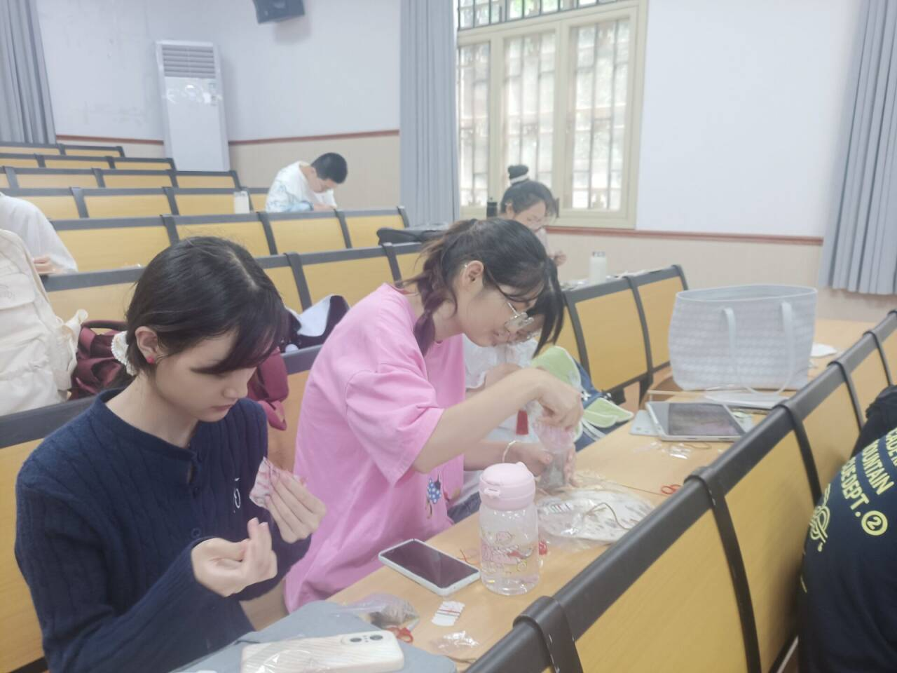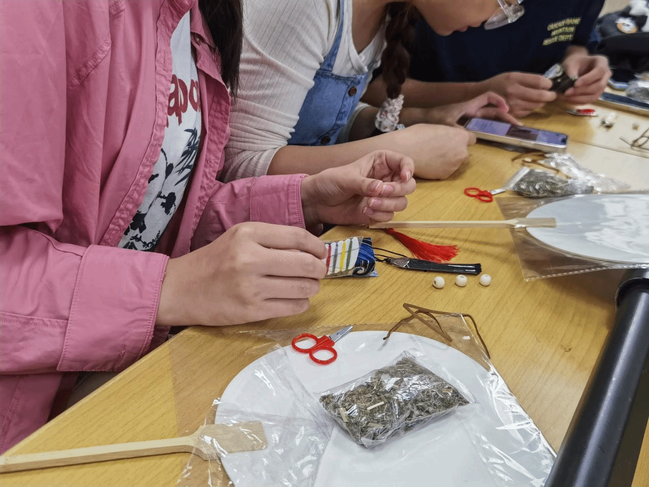 活动进入到制作漆扇和香包的环节时,现场的气氛达到了高潮。主持人讲解制作步骤后,同学们迫不及待地开始了自己的创作。制作漆扇时,同学们精心挑选色彩,搭配出各种独特的组合,制成一把把精美的漆扇。缝制香包更加考验同学们的耐心和细心,同学们努力确保针脚整齐,互相分享缝纫经验,共同解决遇到的问题。