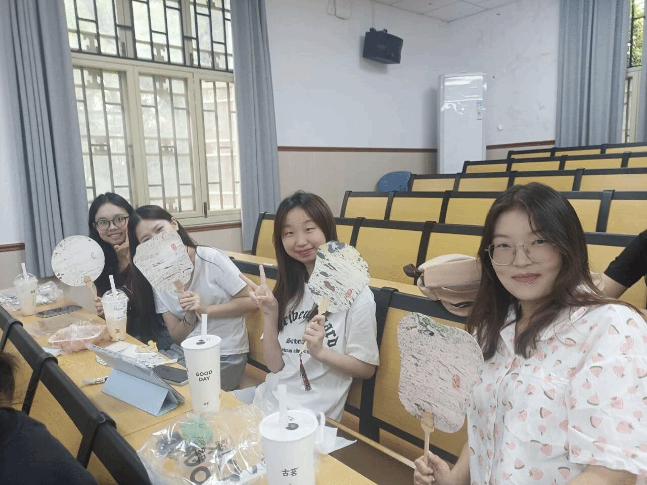 漆扇和香包制作完成后,同学们与自己的作品合影留念,每个人脸上都洋溢着欢乐和成就感。