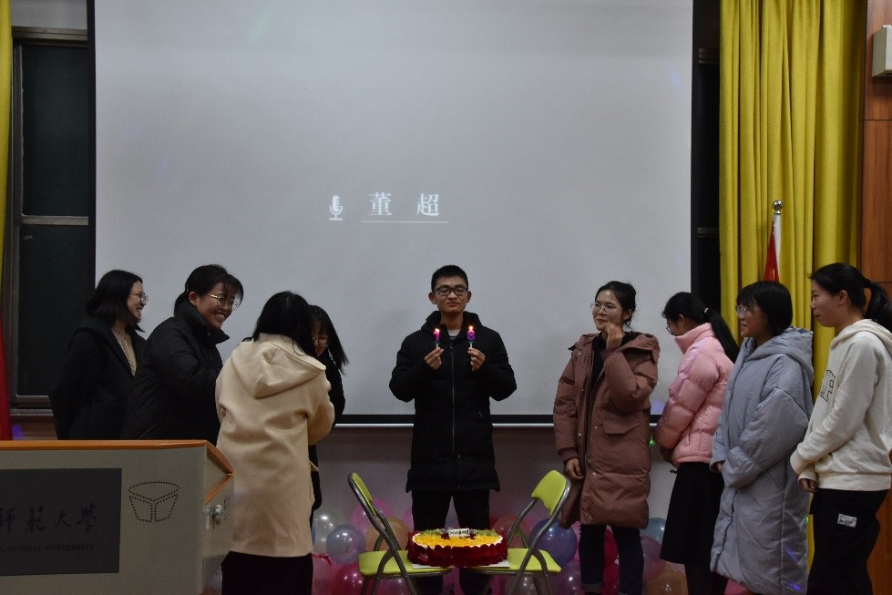 在精彩的表演过后,晚会进入“生日蛋糕分享”环节。2019级团总支为12月份过生日的同学们准备了美味的生日蛋糕。十位寿星逐一登台,陈远瞻切生日蛋糕,“生日快乐歌”洋溢在1101教室的每个角落。随后,晚会进入最后一个环节:“童年照大欣赏”。萌萌的大眼、搞怪的动作……一张张可爱的童年照,不仅包含着同学们的童年记忆,也让同学们在互相的分享中增进了对彼此的了解与认识。
