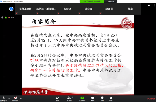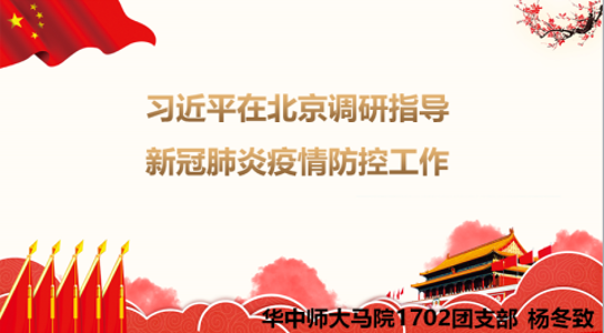 本次团日活动由我院的杨冬致与首师大马院的白盛志两位团支书共同担任主持人,在互相介绍双方院校后,杨冬致带领同学们学习了《习近平在北京调研指导新冠肺炎疫情防控工作中的讲话》,何瑶带领同学们学习了《在中央政治局常委会会议研究应对新型冠状病毒肺炎疫情工作时的讲话》,从集中救治、社会管控、舆论引导、统一指挥等多方面学习讲话精神,号召同学们从自身出发,积极参与防控,坚定信心,共克时艰。