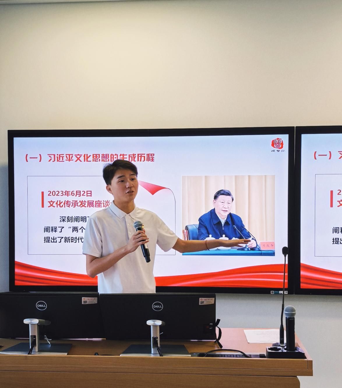 主论坛上研习社社长刘伟俊围绕议题一“党的作风关系人心向背,决定党和国家事业成败”作题为《徙木立信——党的作风建设永远在路上》的汇报分享。下午1时40分,分论坛三在中国人民大学通州校区西区学部楼207教室举行。研习社社长刘伟俊围绕分论坛三议题——“历史之维:坚定文化自信,不断增强中国人的志气骨气底气”,作题为《学习理解习近平文化思想的核心要义》的汇报分享。他从习近平文化思想的生成历程、底蕴内涵和原创性贡献三个维度,与分论坛参会人员展开交流。