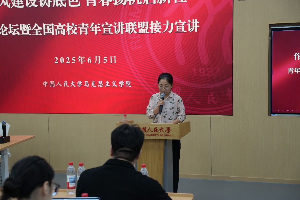 马克思主义学院讯(通讯员 郑景升 李佳蔓)6月5日,由中国人民大学马克思主义学院主办的“作风建设铸就底色 青春扬帆启新程”青年论坛暨全国高校青年宣讲联盟接力宣讲活动在中国人民大学通州校区举办。复旦大学马克思主义学院教授杨德山、中国人民大学马克思主义学院团委书记李晓雨以及30余所高校师生代表出席论坛。华中师范大学习近平新时代中国特色社会主义思想学生研习社(以下简称“研习社”)社长刘伟俊、部门负责人李佳蔓、研习社成员郑景升受邀参会。