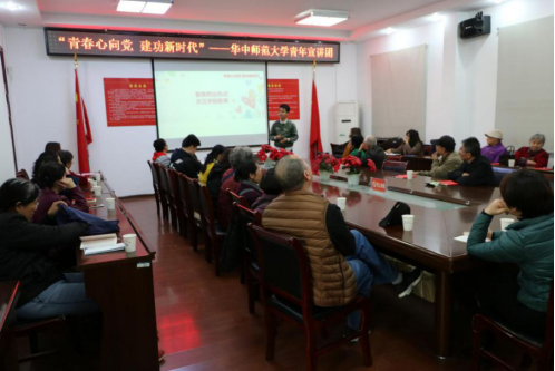 “新时代中国青年要树立远大理想、要热爱伟大祖国、要担当时代责任、要勇于砥砺奋斗、要练就过硬本领、要锤炼品德修为。”为进一步深入贯彻落实习总书记关于青年工作的重要思想,激励和引导广大华研学子在常学常新中加强理论修养,在真学真信中坚定理想信念,在学思践悟中牢记初心使命,华中师范大学习近平新时代中国特色社会主义思想学生研习社联合华中师范大学研究生会组建起一支华研“青年宣讲团”队伍展开系列宣讲活动,展示当代青年学子砥砺梦想、拼搏实干的气质与风貌。华研“青年宣讲团”于2019年4月14日-22日赴武汉市华师大社区、武汉华大鸿图文化发展有限责任公司、江汉分局巡警大队、中建三局武船双柳基地项目部等地开展了系列宣讲活动。