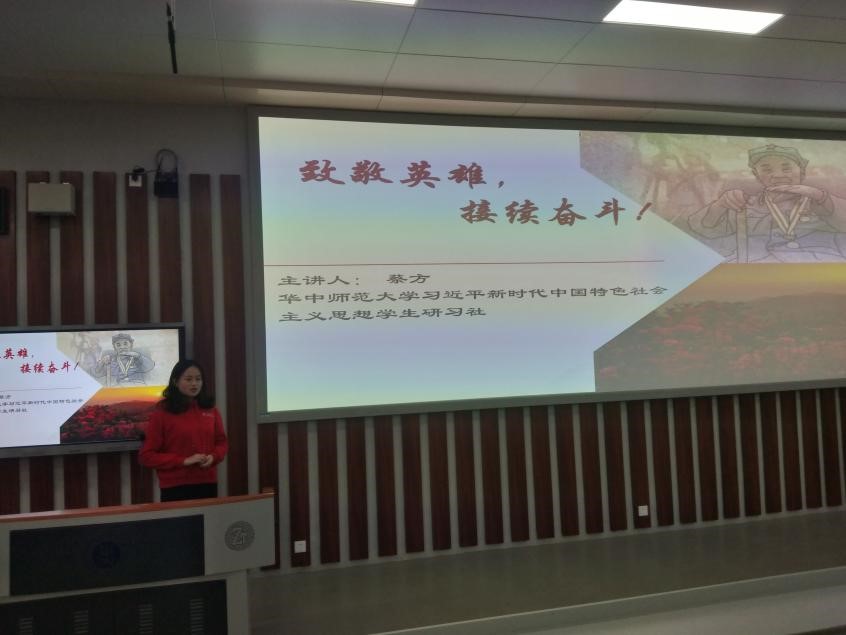 蔡方以歌曲“映山红”引入主题,结合家乡人和事分享有关传承英雄精神的一些思考。她通过讲述老红军王承登的故事,引出总书记关于传承英雄的重要讲话,并从弘扬中华民族优秀传统、时代需求和现实条件三个角度出发说明弘扬英雄精神的重要意义。她指出,在新中国成立七十周年之际,新时代青年除了自豪于祖国的繁荣富强,感慨今非昔比的幸福生活时,还应该向英雄们的付出、奋斗、牺牲致敬。最后点明新时代长征路上,面对难题难关,我们仍然呼唤英雄,要不忘初心,牢记使命,致敬英雄,接续奋斗。