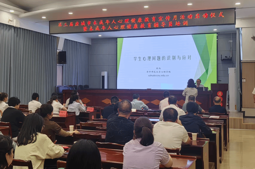马克思主义学院讯(通讯员 桂磊 徐秉国;摄影 徐秉国)为了推动学校、家庭、社会共同守护未成年人健康成长,培养“学校好学生、家庭好孩子、社会好公民”。5月23日,由华中师范大学马克思主义学院承建的湖北省“理论热点面对面”实践基地开展系列活动。华中师范大学—孝感应城市“理论热点面对面”实践基地开展未成年人心理健康教育辅导员培训。本基地来自政法系统、教育系统、卫健系统从事未成年人心理健康教育辅导的骨干力量,以及“爱心妈妈”代表和志愿服务领域的爱心人士等近百人参加了培训。